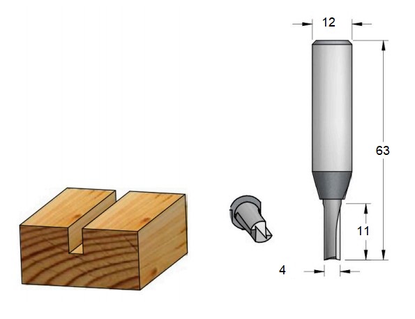 Fresa de ranurado recto con un diámetro de corte D4 mm y un mango S12. Este cortador se utiliza para crear ranuras de 4 milímetros de ancho en diversos materiales, como madera, plástico y superficies sólidas.