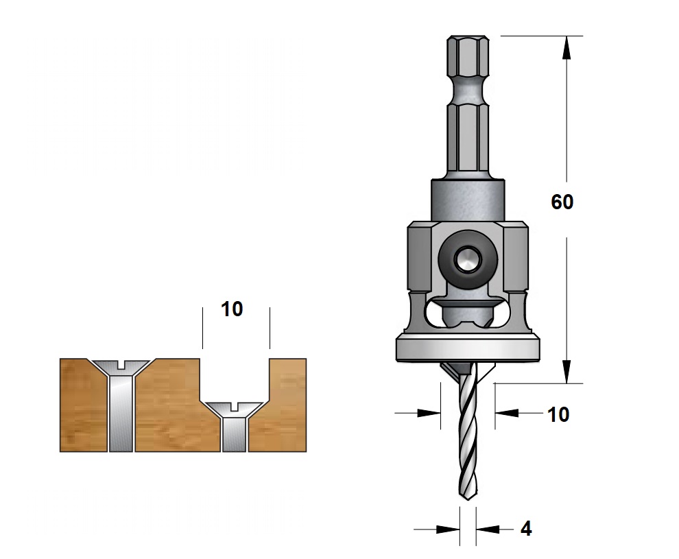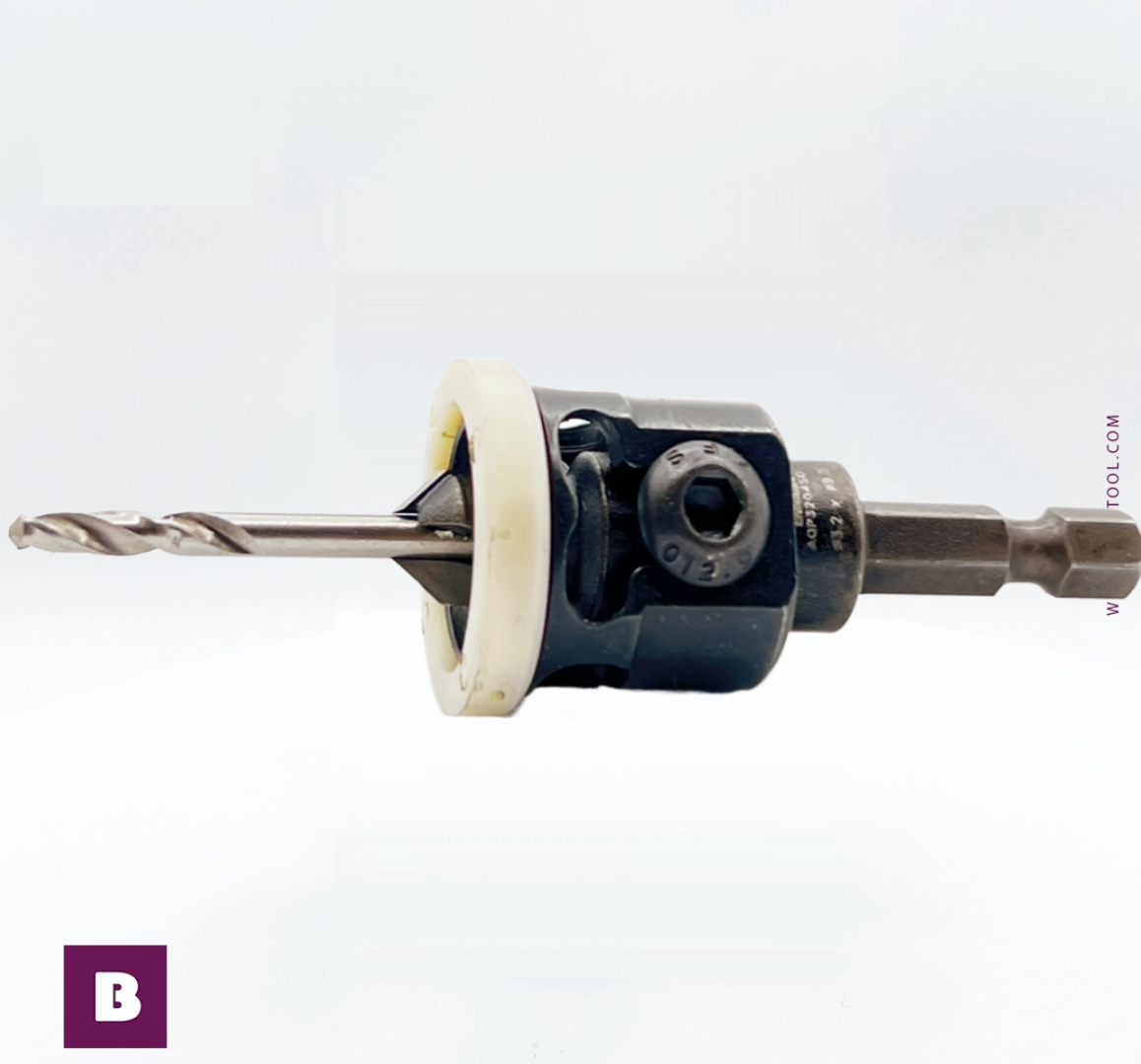 Avellanador de baja fricción con tope de profundidad ajustable y Broca HSS recta. Cambio rápido 1/4 (6.3 mm) Mango hexagonal adaptable a todos los atornilladores estándar.