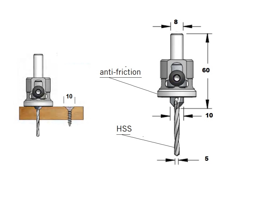 Avellanador de baja fricción con tope de profundidad Broca de 5 mm y fresa de 10 mm