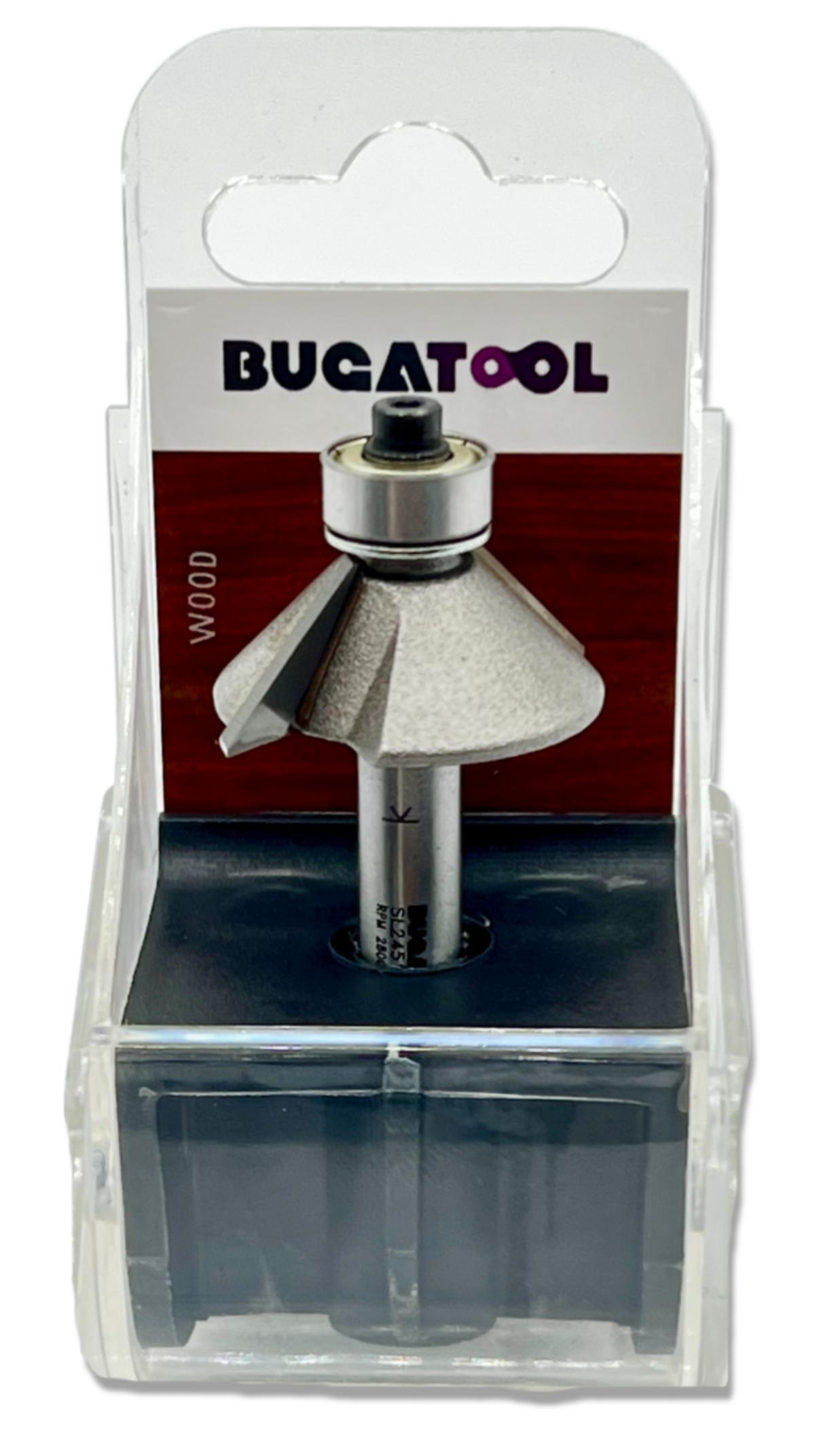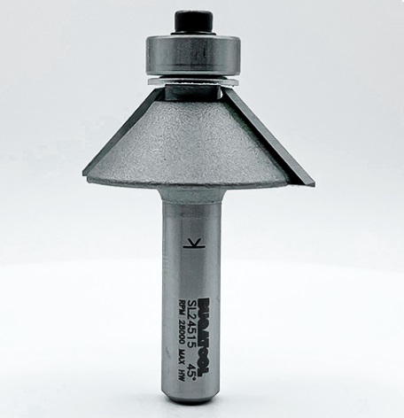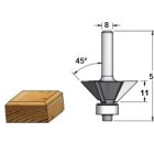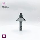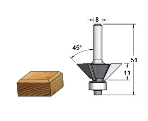 La Fresa de cortar a 45º con vástago S8 y 2 cuchillas es utilizada en fresadoras de mano y fresadoras de mesa. Esta fresa crea cantos en ángulo de 45 grados en materiales como madera y superficies sólidas.