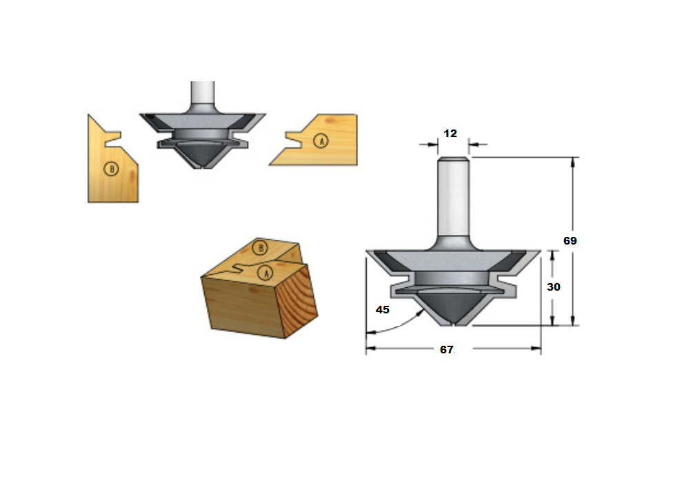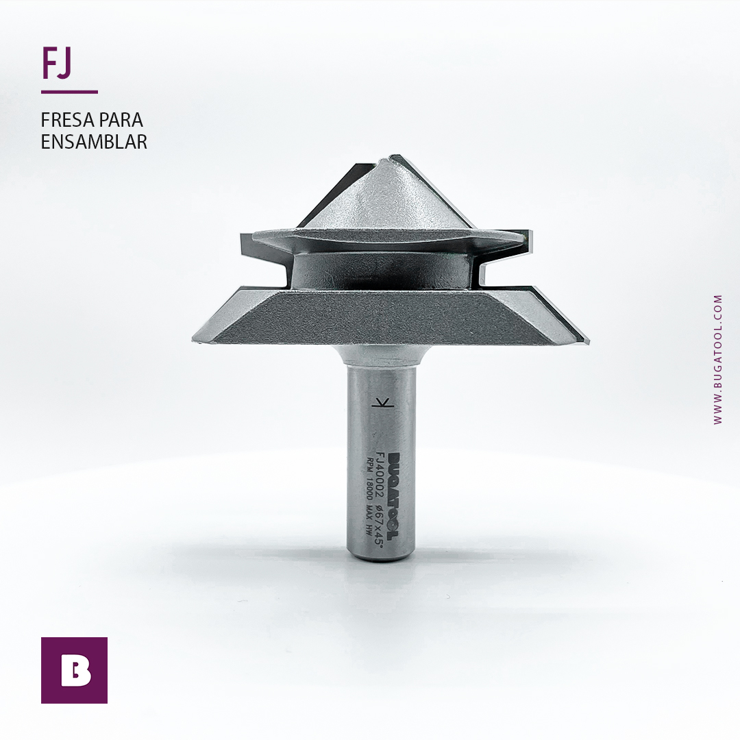 La fresa de ensamble a 45º es una herramienta especializada utilizada para fresar machihembrados en tableros de madera y formar ángulos perfectos de 90 grados en las esquinas.