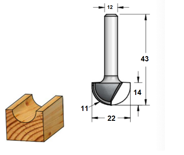 La fresa tiene un diámetro de 22 mm y un radio de 11 mm, lo que permite cortes precisos y suaves en superficies curvas. La profundidad de corte es de 14 mm, lo que permite realizar trabajos de mayor envergadura. La altura total de la fresa es de 57 mm, lo que asegura un buen agarre y un control adecuado durante el uso.