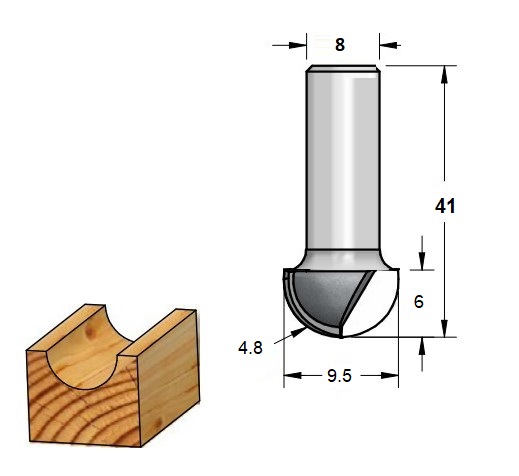 Fresa de radio convexo con vástago S8 diseñada para trabajos en madera y materiales compuestos duros.