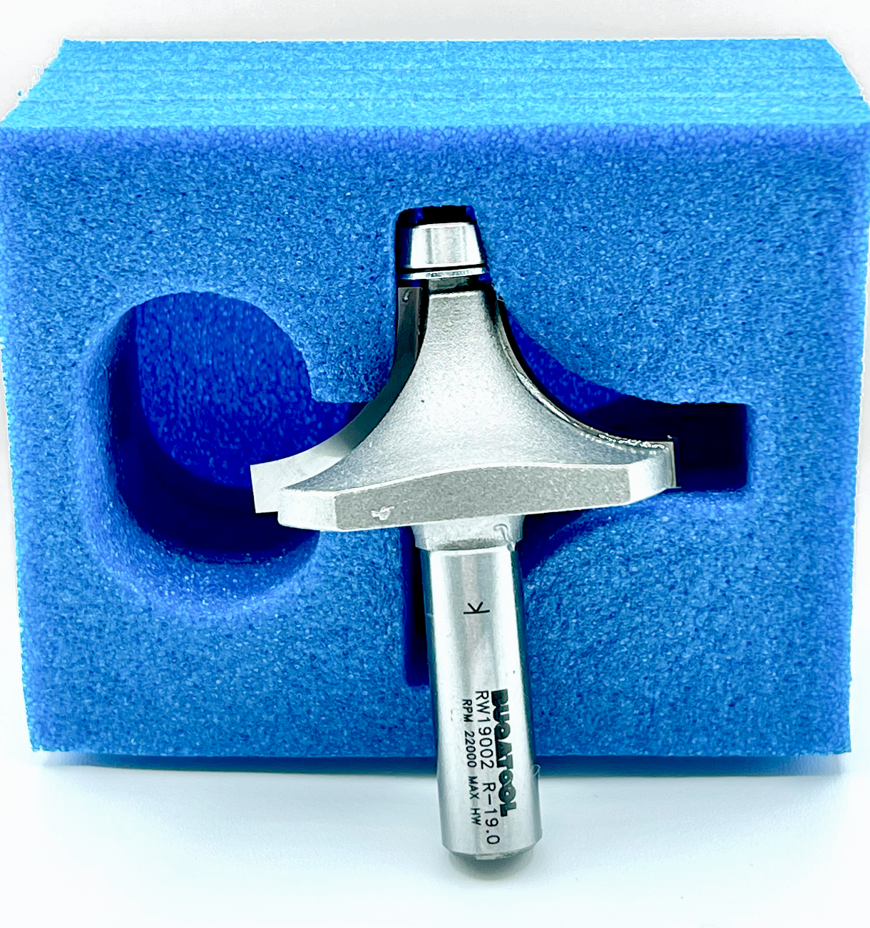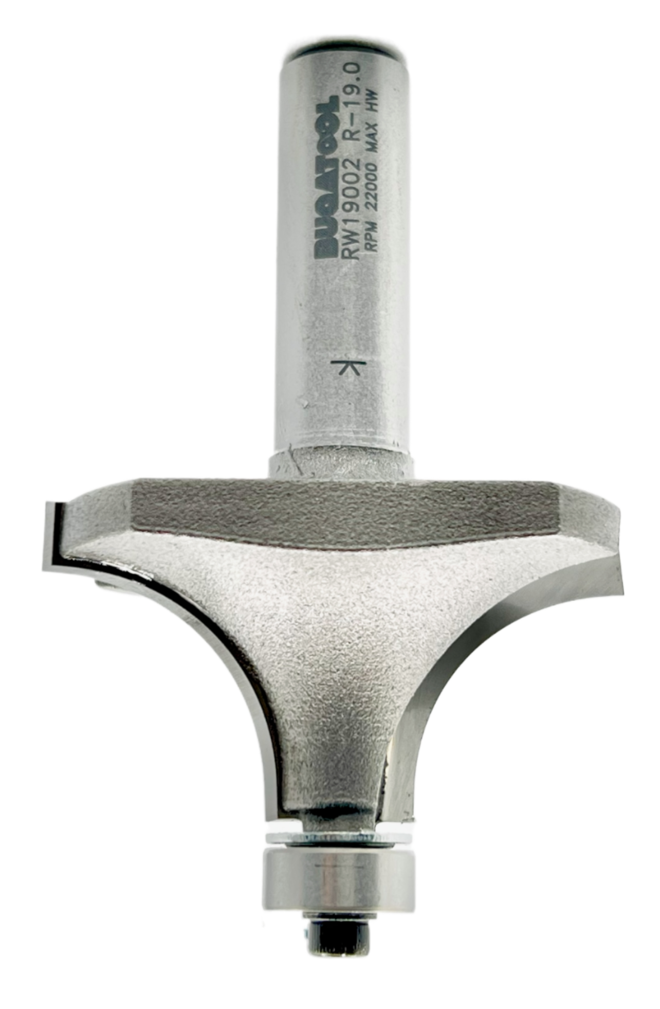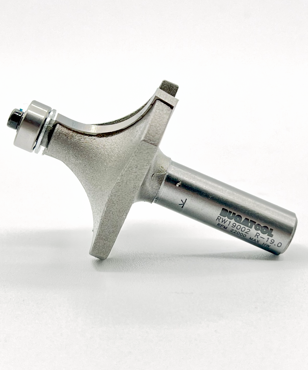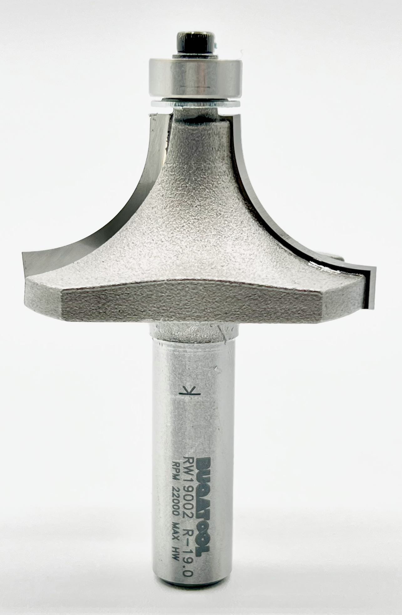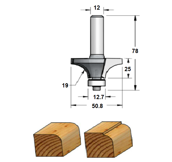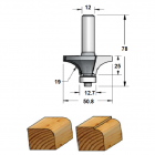 Fresa industrial de radio 19 mm para redondear cantos de madera con 2 cuchillas con vástago S12 y rodamiento de metal.