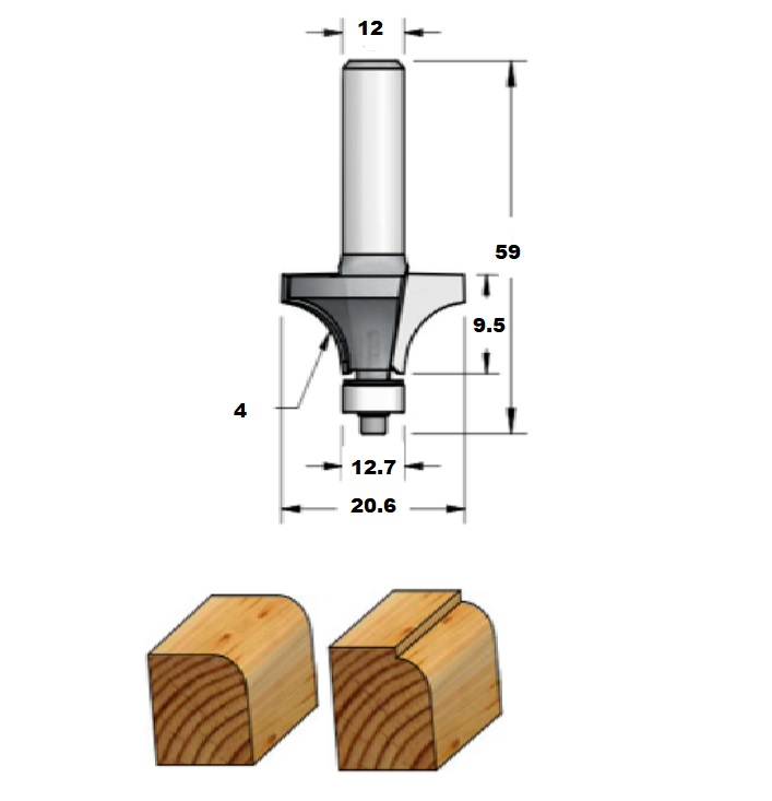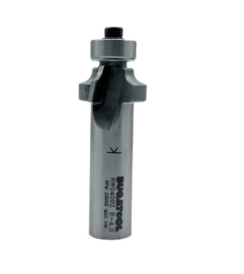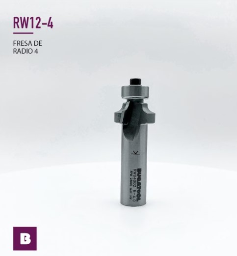 Fresas de radio para redondear cantos de madera con 2 cuchillas con vástago S12 y rodamiento de metal. Son herramientas de corte utilizadas para dar forma a los bordes de tableros de madera. La fresa tiene dos cuchillas que permiten un corte rápido y suave, lo que facilita el trabajo de dar forma a los bordes.