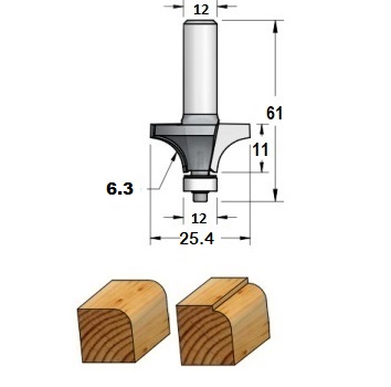 Fresa industrial de radio 6 mm para redondear cantos de madera con 2 cuchillas con vástago S12 y rodamiento de metal.